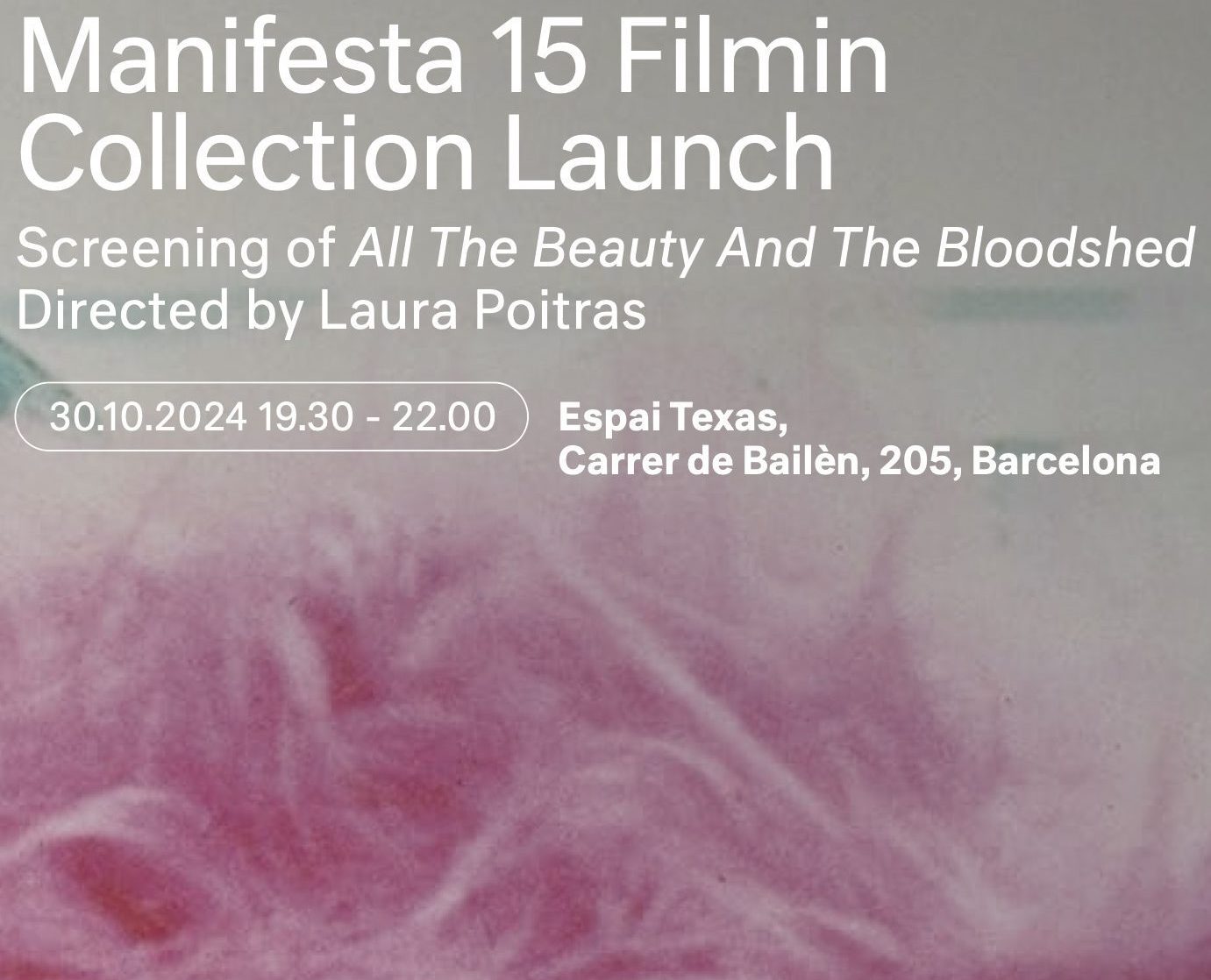 Els Cinemes Texas acull la inauguració del canal Manifesta 15 de Filmin. Per a celebrar aquesta col·laboració especial el festival projectarà un dels documentals internacionals més guardonats i celebrats dels últims temps, All The Beauty And The Bloodshed, dirigit per Laura Poitras, una de les participants de Manifesta 12 Palerm.